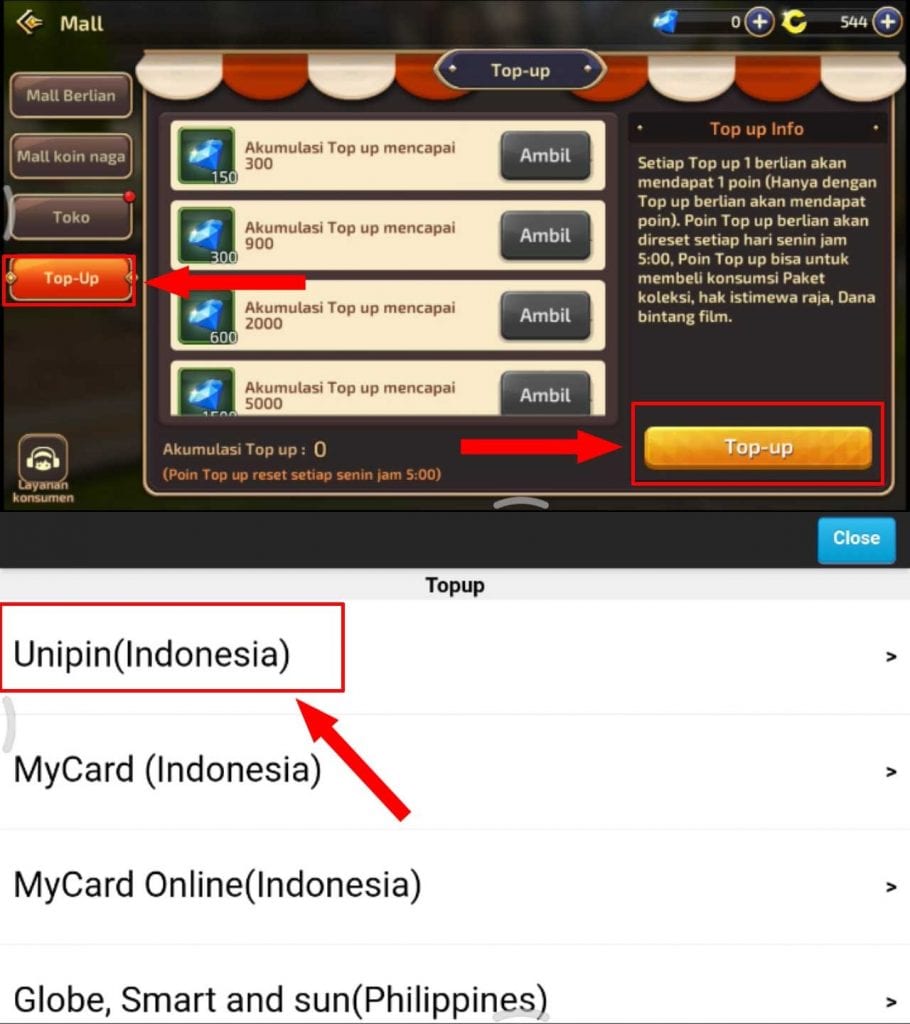 Langkah ketiga, pilih menu Top-Up lalu tap lagi tombol Top-Up yang berwarna kuning. Jika aplikasi tambahan Dnmob sudah terinstall dengan benar maka akan muncul opsi pembayaran melalui UniPin dan pembayaran – pembayaran yang lain. setelah itu pilih saja Unipin (Indonesia).