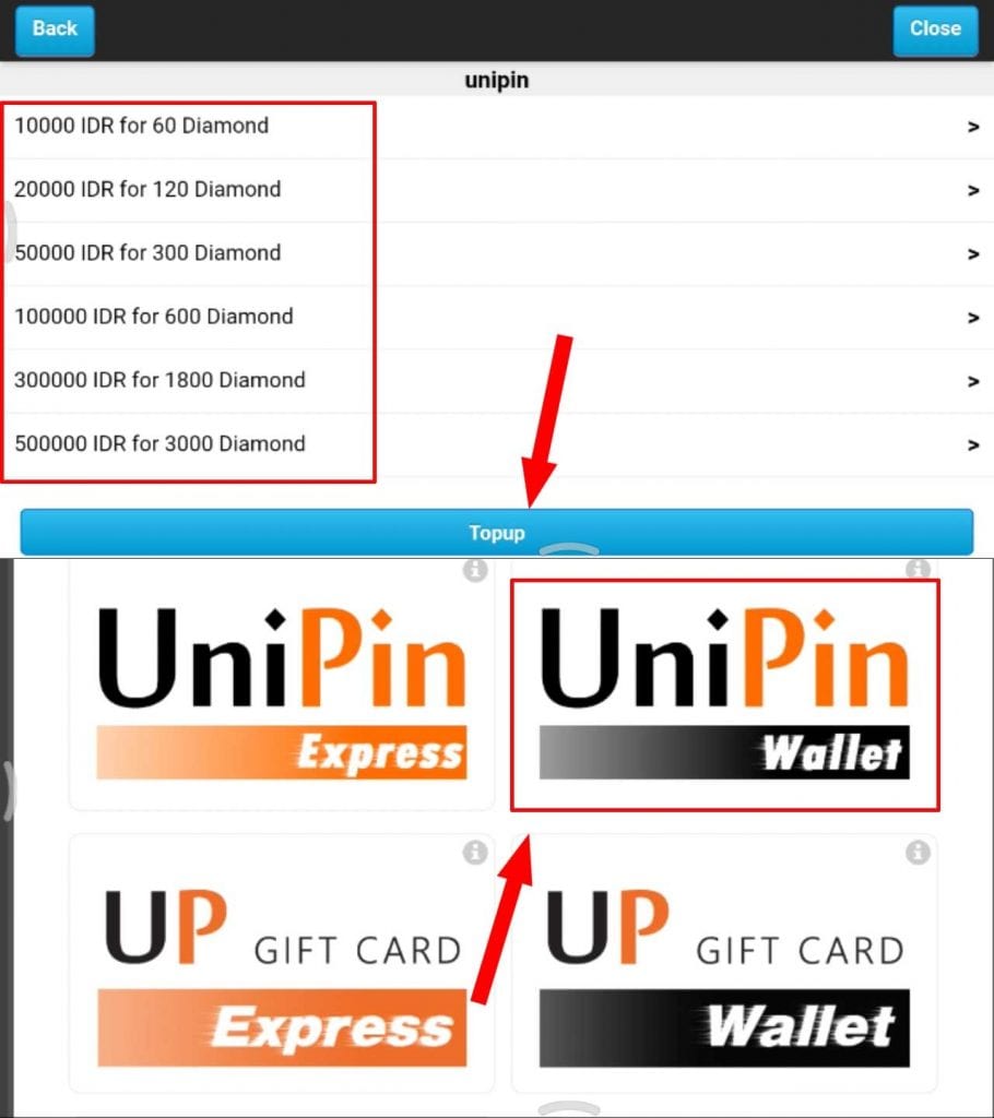 Langkah keempat, pilih nominal Diamond yang ingin kamu beli selanjutnya tap Topup. Pada menu selanjutnya langsung saja pilih UniPin Wallet.