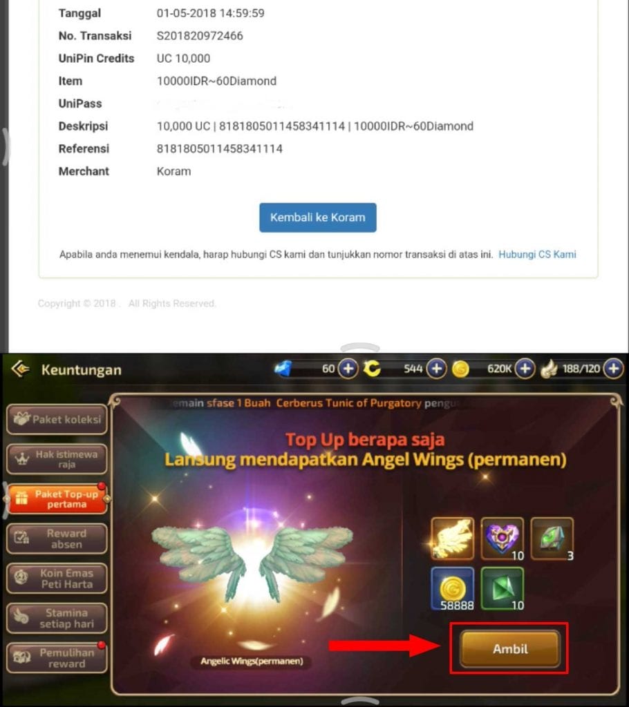 Langkah keenam, akan ada notif detail pembelian diamond atau transaksi sukses. Kemudian kembali lagi ke game dan ambil hadiah sayap permanen kamu.