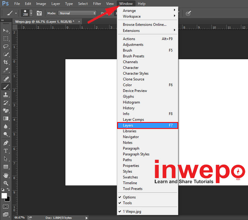 Meskipun cara untuk menampilkan-nya cukup mudah tetapi jika untuk kamu yang belum mengetahui-nya pasti akan terasa sulit sekali. Sebelum lanjut ke tutorial, penulis ingin menjelaskan apa itu Pallete Window. Pallete Window yaitu semua menu yang ada di dalam atau di bawah Window. Seperti : menu Action Animation, Brushes, Channel, Character, Color, Histogram, History, Info, menu Layer com, Layer, Navigator, Option, Paragraph, Path, Style, Swatches, Tool Preset, dan Tools. Langsung saja berikut cara menampilkan Pallete Layer yang hilang di Photoshop: