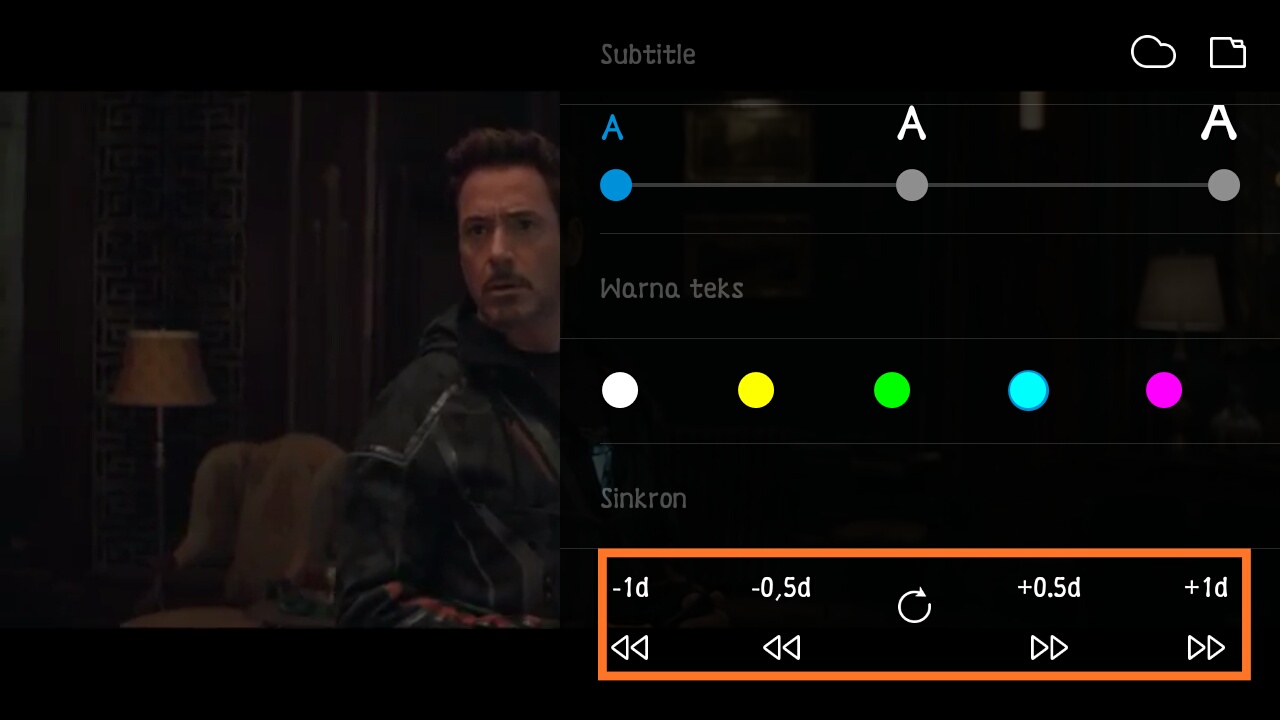 Catatan: Jika subtitle tersebut tidak cocok atau tampilnya teks kurang tepat dengan film, kamu bisa mengaturnya dengan Tap ikon huruf A – scroll kebawah – atur waktu subtitle sampai cocok dengan film.Â
