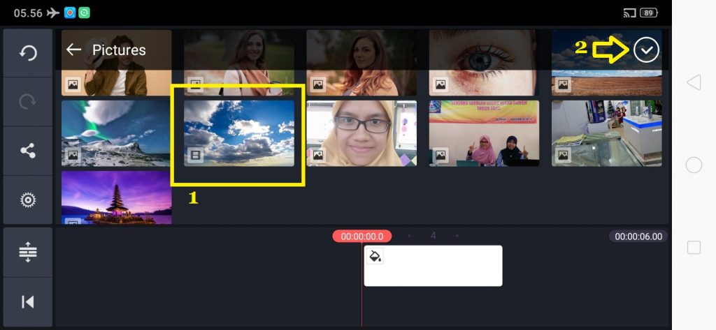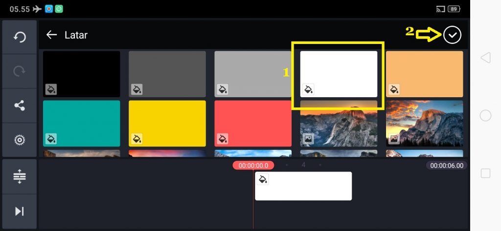 Pilih background bawaan KineMaster, disini saya menggunakan warna putih. Klik centang.
