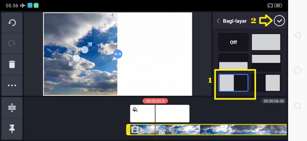 Pilih bagi layar samping kiri, dan klik centang. Secara otomatis video akan berada di sebelah kiri memenuhi sebagian frame.