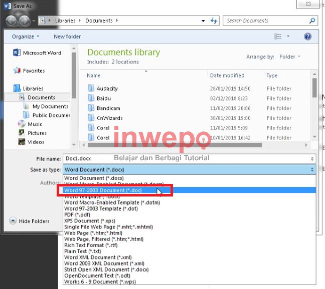5. Kamu cari tempat yang cocok untuk menyimpan berkas dokumen tersebut, sebelum kamu klik tombol save, kamu klik pada file type dan ubah menjadi .doc dan kamu klik save.