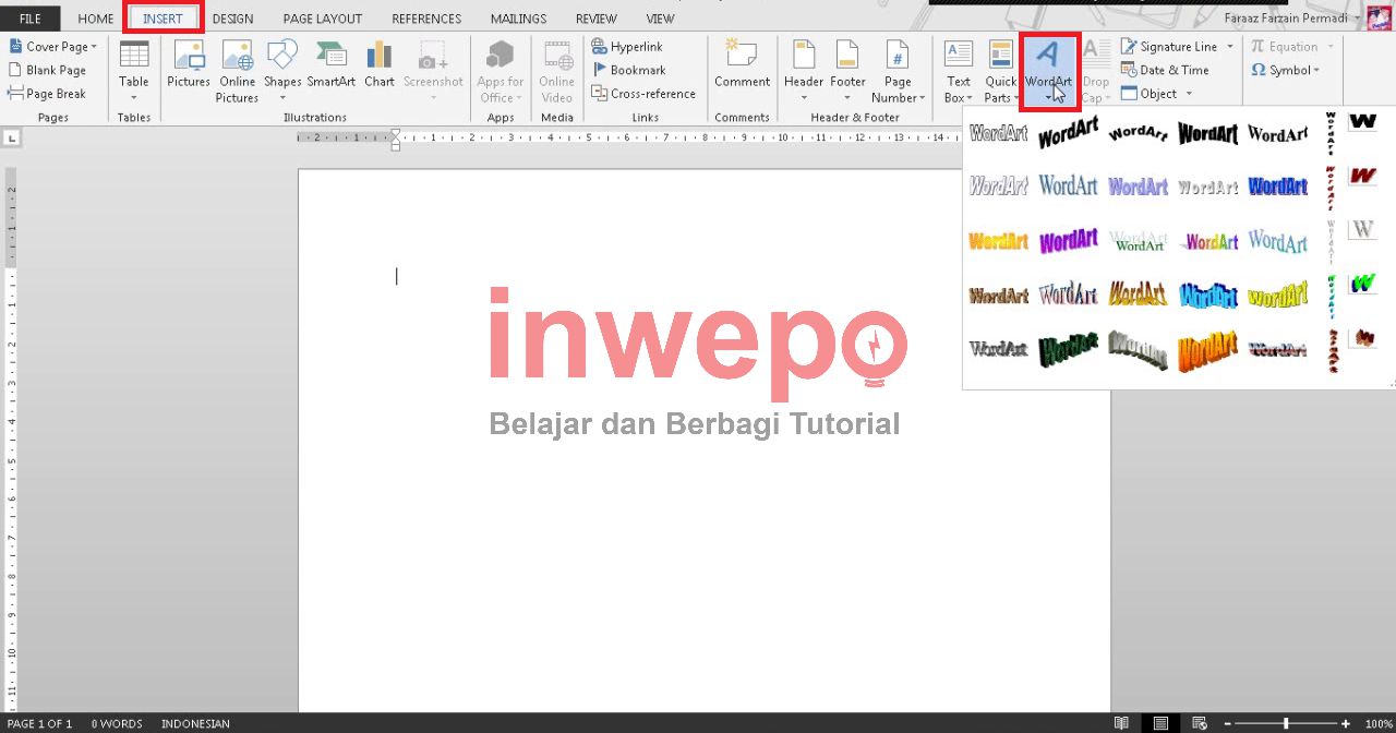 6. Lalu kembali ke lembar kerja kamu, coba kamu buka WordArt-nya di menu insert, pasti akan berubah menjadi versi lama Microsoft Word.