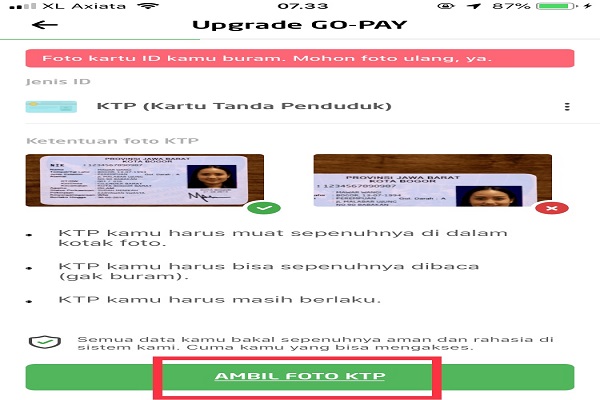 Untuk diperhatikan bahwa foto yang kurang jelas akan mengakibatkan penolakan sistem Gojek dan kamu akan diminta kembali meng-upgrade sampai benar-benar foto terlihat jelas dan dinyatakan berhasil.