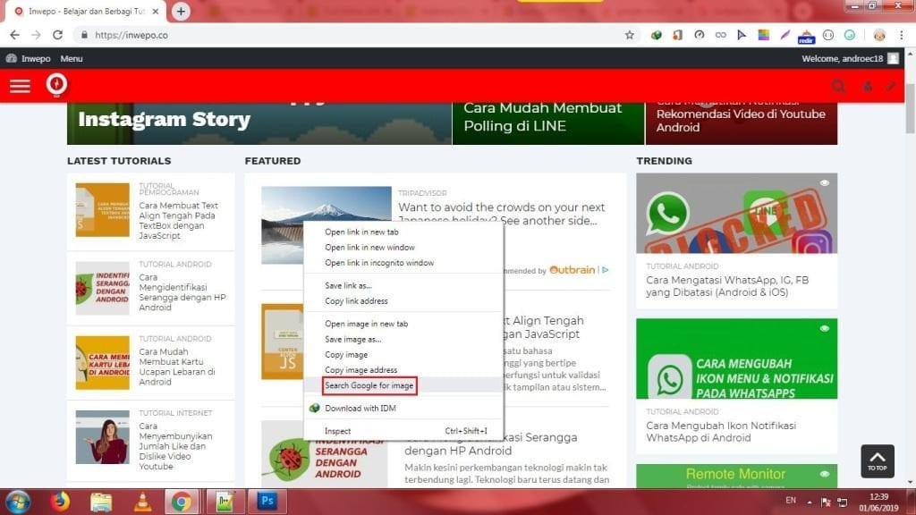 4. Klik kanan mouse pada gambar tersebut – Pilihlah Search Google for Image. Nanti akan membuka halaman tab baru untuk memproses pengiriman gambar tersebut ke Google Image.