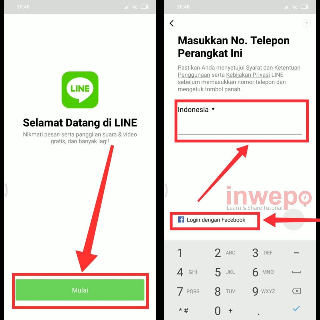 1. Langsung kita buka aplikasi LINE messenger jika belum memiliki silahkan download terlebih dahulu. Selanjutnya tap menu Mulai lalu login menggunakan nomor selular atau bisa juga login menggunakan Facebook.