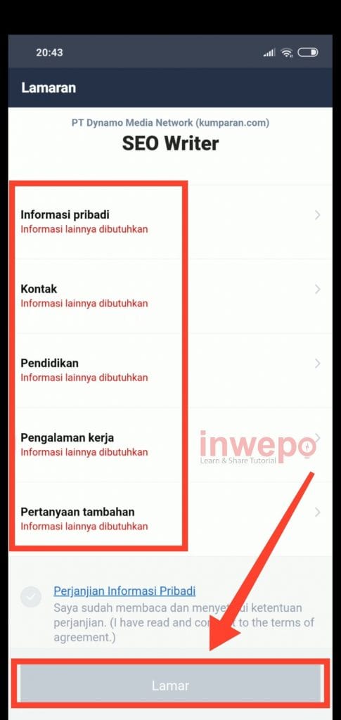 5. Masukkan data diri dan juga syarat-syarat pada kolom yang disediakan. Jika sudah semua tap menu Lamar.