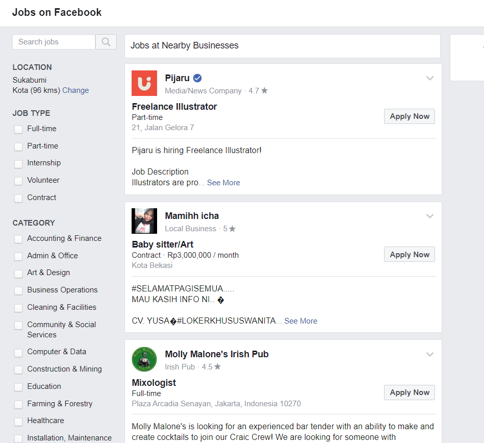 Catatan: berhati hatilah memilih pekerjaan karena pada form ini semua orang bisa membuat postingan mencari pekerja, mungkin saja terdapat orang yang tidak bertanggung jawab dengan memanfaatkan akses tersebut untuk melakukan tindakan yang tidak diinginkan, pastikan untuk mengecek ke asliannya, jangan takut menghubungi pencari pekerja tersebut, jika kamu juga ingin mencari seoarang pegawai kamu juga bisa memanfaatkan layanan yang disediakan oleh Facebook tersebut.