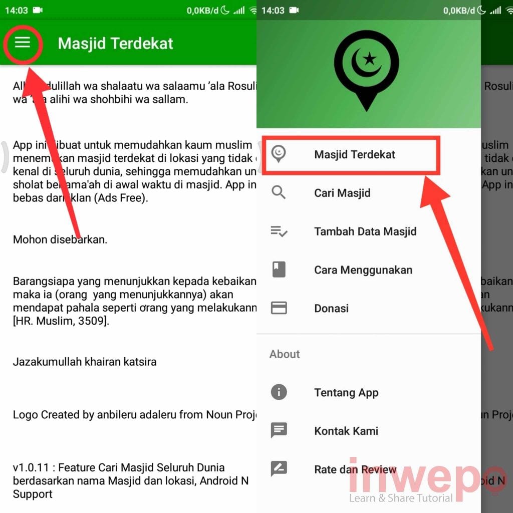 2. Tap pada 3 garis yang berada di bagian pojok kiri atas untuk memunculkan menu yang lain. Lalu tap menu Masjid Terdekat. Jangan lupa untuk memberi izin akses di aplikasi agar bisa bekerja dengan baik.
