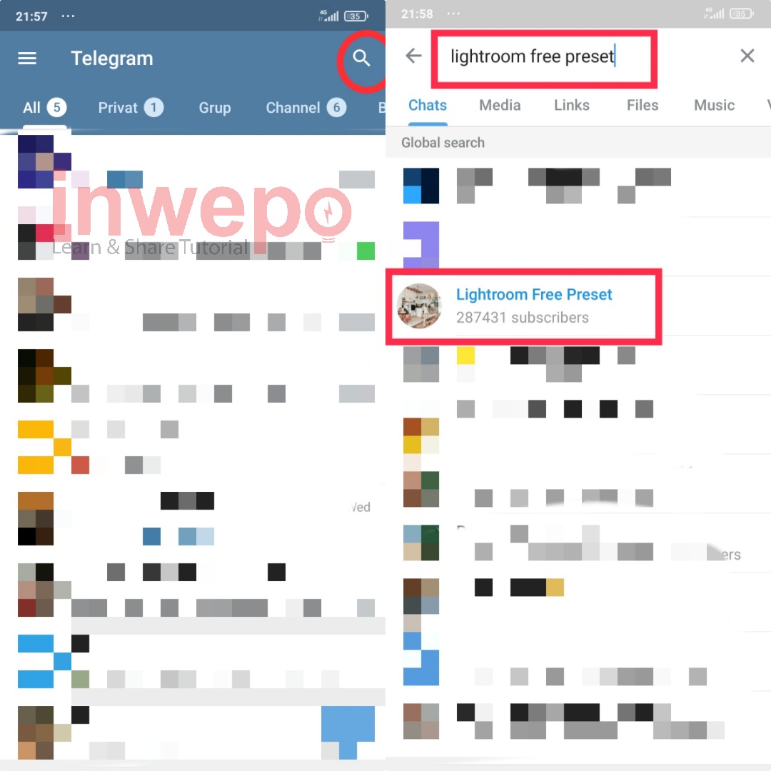 1. Kamu buka aplikasi Telegram yang ada di smartphone kamu masing masing-masing. Setelah itu masuk ke kolom pencarian dan ketikkan ” lightroom free preset “. Berikutnya pilih channel yang memiliki banyak pengikut atau seperti pada gambar di bawah ini.