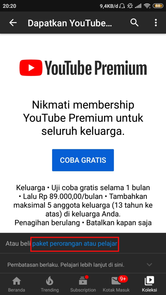 3. Pada halaman penawaran Youtube Premium, terdapat dua paket (Perorangan dan Keluarga) langganan yang dapat dipilih oleh pengguna. Pilih opsi paket yang kita inginkan sesuai dengan keperluan. Pada artikel kali ini, penulis memilih paket perorangan dengan cara menekan opsi paket perorangan atau pelajar yang berada di bawah halaman.