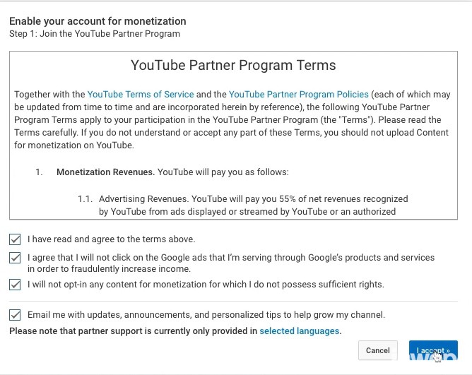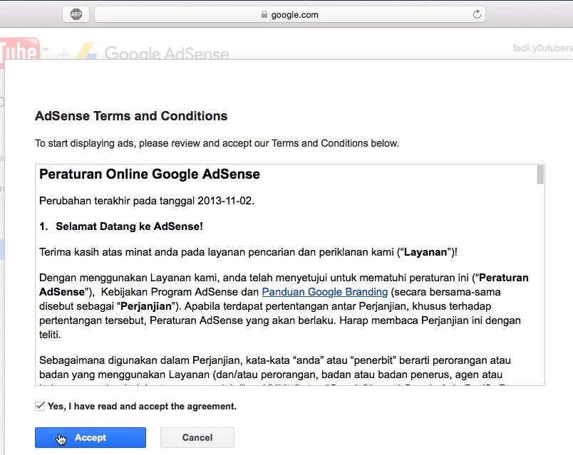 4. Selanjutnya centang semua peraturan perjanjian YouTube Partner Program Terms – Set up Adsense Account.