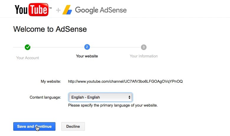 6. Selanjutnya pilih bahasa akun Adsense yang ingin kamu gunakan, lalu Save and Continue.