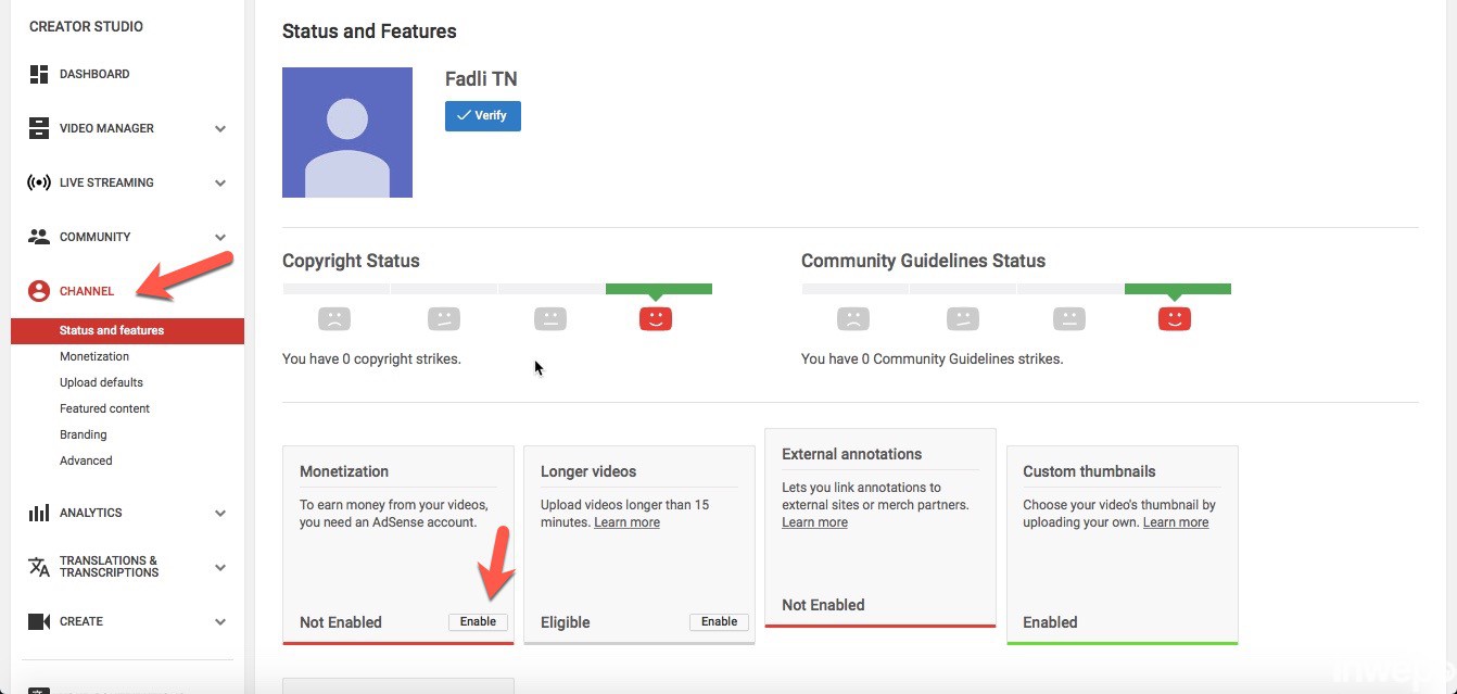 2. Selanjutnya masuk ke menu CHANNEL, kemudian klik Enable di menu Monetization.