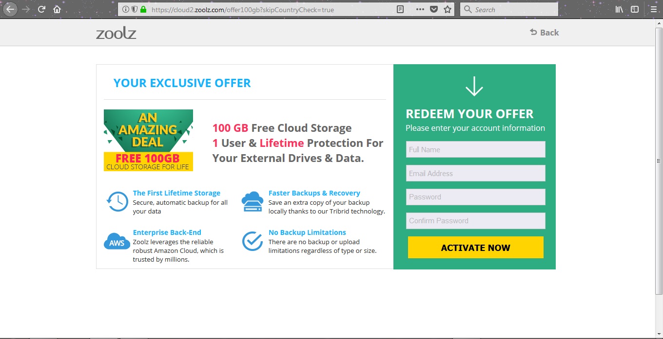 1. Buka landing page situs https://cloud2.zoolz.com/offer100gb?skipCountryCheck=true . Tautan ini adalah tautan asli dari landing page promosi mereka. Bukan link referral atau sejenisnya. Jadi aman.