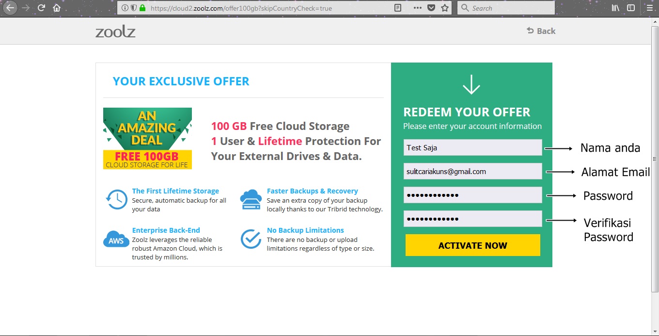 3. Setelah semuanya selesai diisi dan di klik tombol Activate now, maka kamu sudah berhasil mendapatkan Cloud Storage 100 GB Free dari zoolz. Untuk lebih greget lagi, kamu bisa mengunduh aplikasi mereka untuk platform Windows, agar proses backup dan restore data jadi lebih mudah.