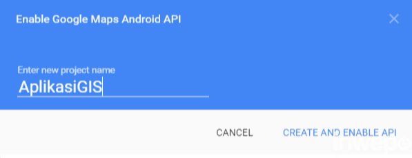 Kemudian akan muncul jendela popup seperti dibawah ini, buat sebuah project baru dengan nama bebas, lalu pilih “CREATE AND ENABLE API”.