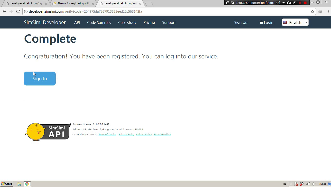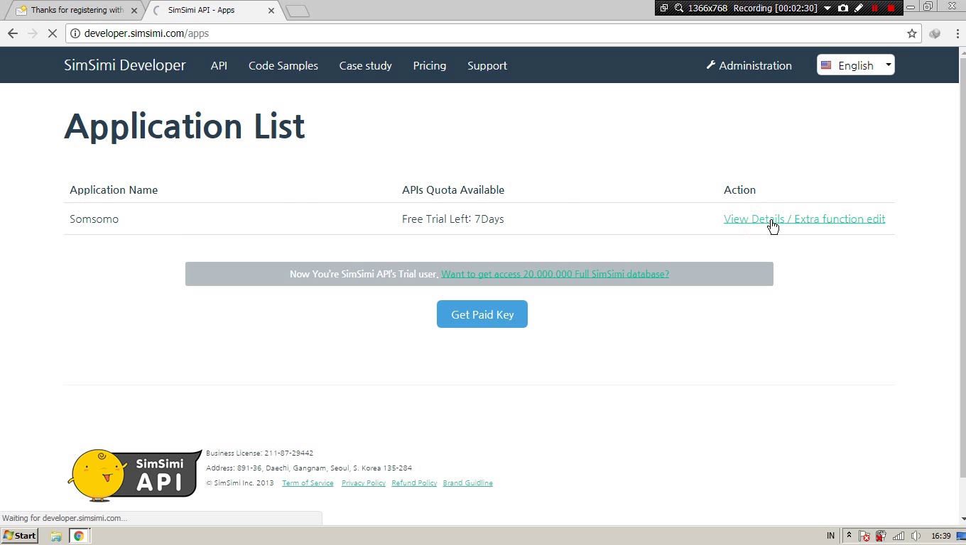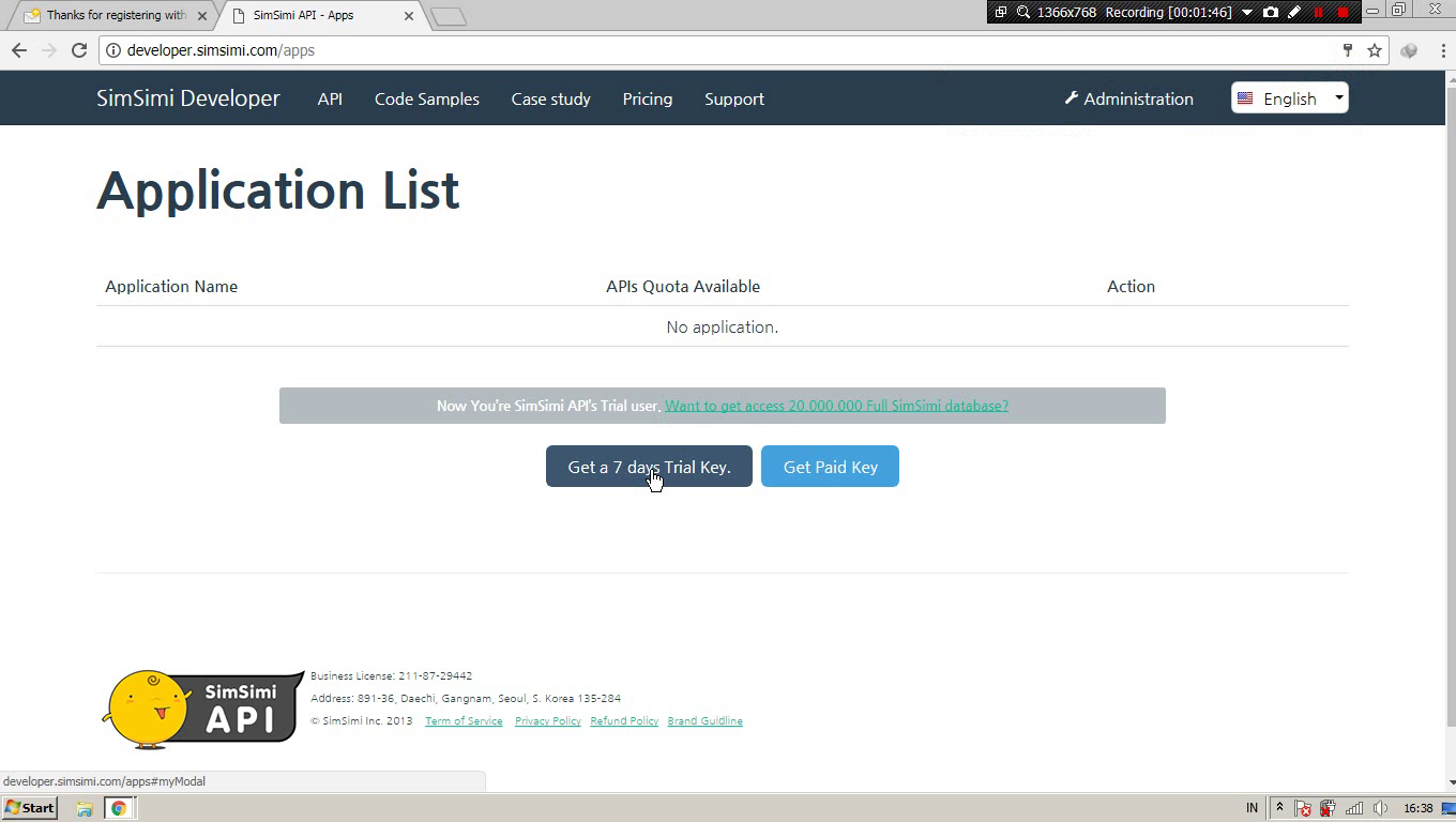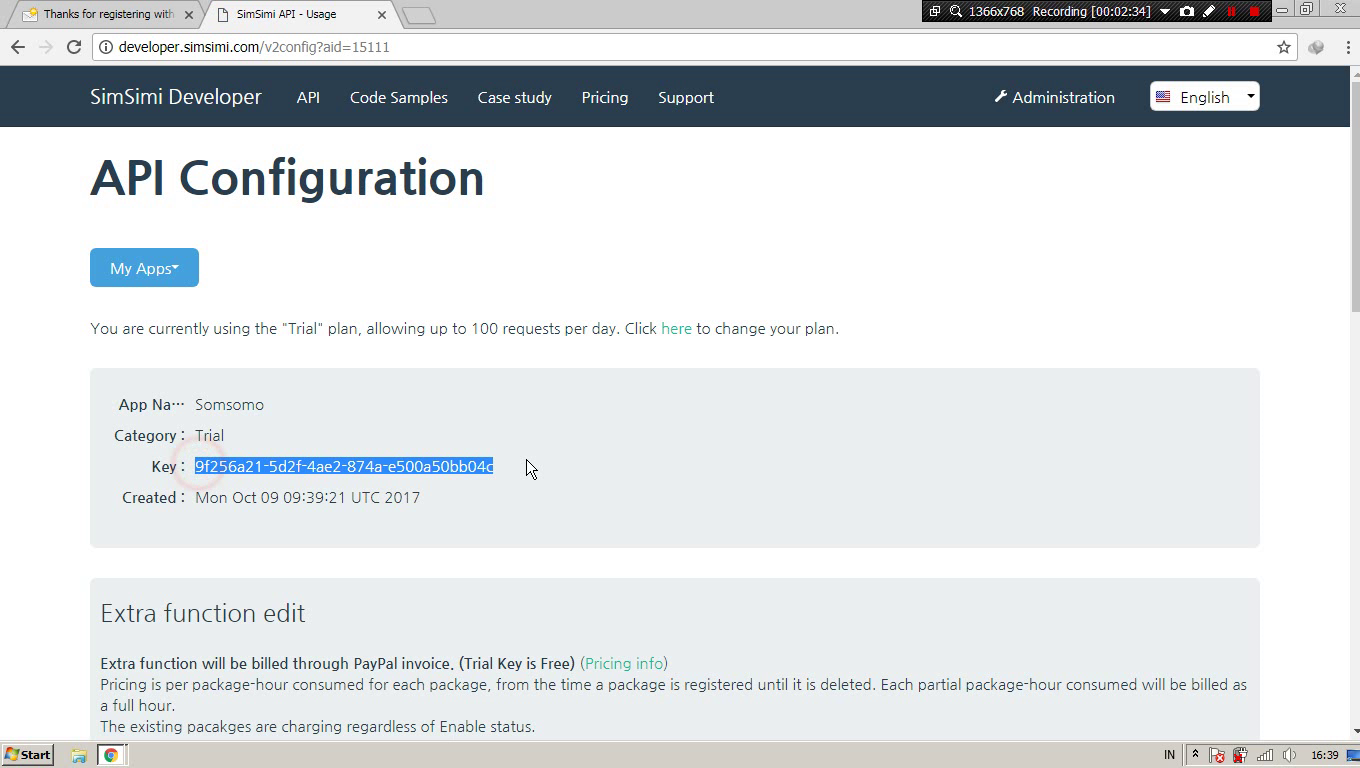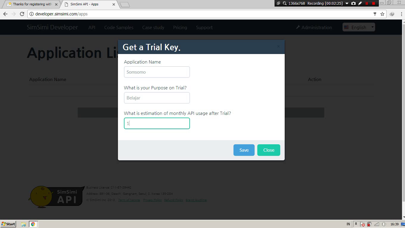 Kamu akan mendpatkan API Key simsimi secara gratis selama 7 hari.