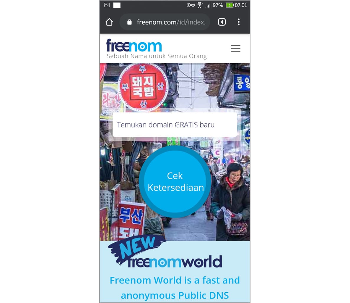 3. Setelah VPN tersambung, silakan buka situs Freenom di Chrome, kemudian ketikkan nama domain yang ingin digunakan di kotak pencarian nama domain, cek ketersediaan.
