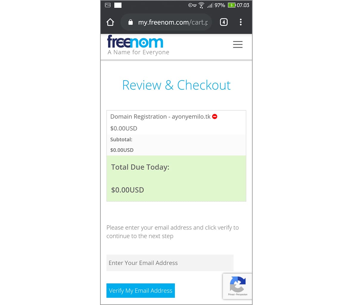 6. Jika sudah, silakan masukkan email yang belum pernah didaftarkan ke Freenom sebelumnya. Di sini, email yang digunakan adalah Gmail.