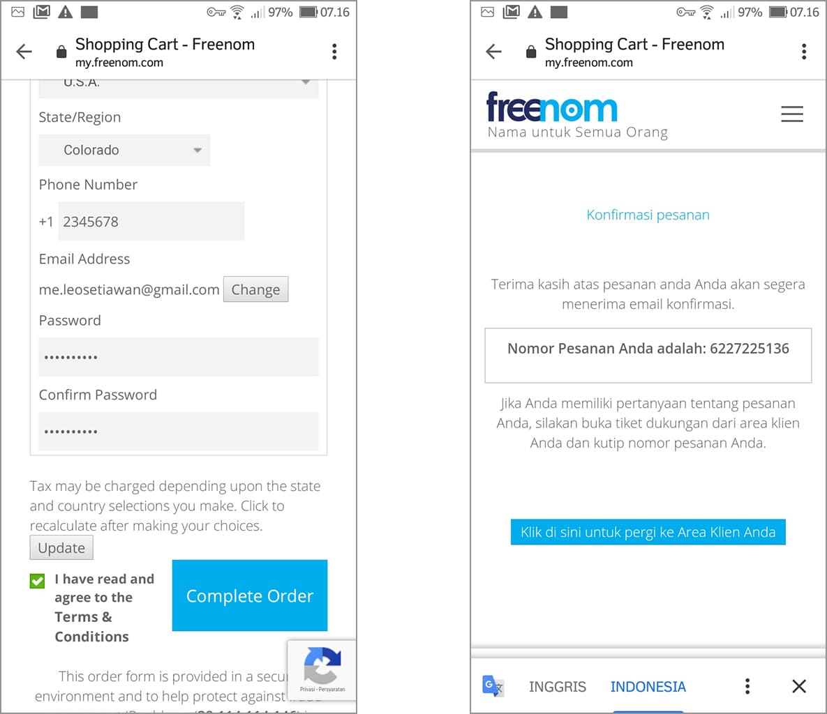 9. Jika semua data sudah lengkap, pastikan kamu mencentang term and conditions, kemudian ketuk complete order, dan domain sudah berhasil kamu dapatkan.
