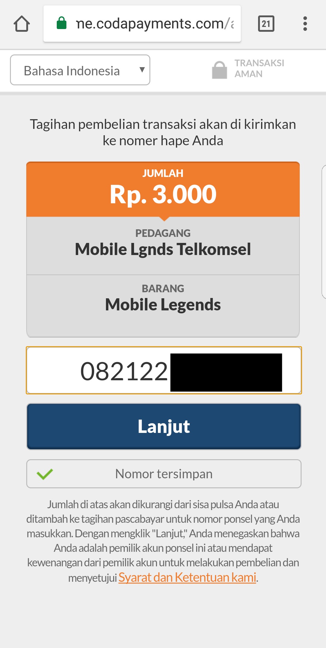 7. Selanjutnya akan dialihkan ke pembayaran, masukan nomor telepon untuk pembayaran melalui pulsa (nomor yang kamu gunakan harus memiliki pulsa yang cukup untuk pembayaran). Lalu tap tombol Lanjut.