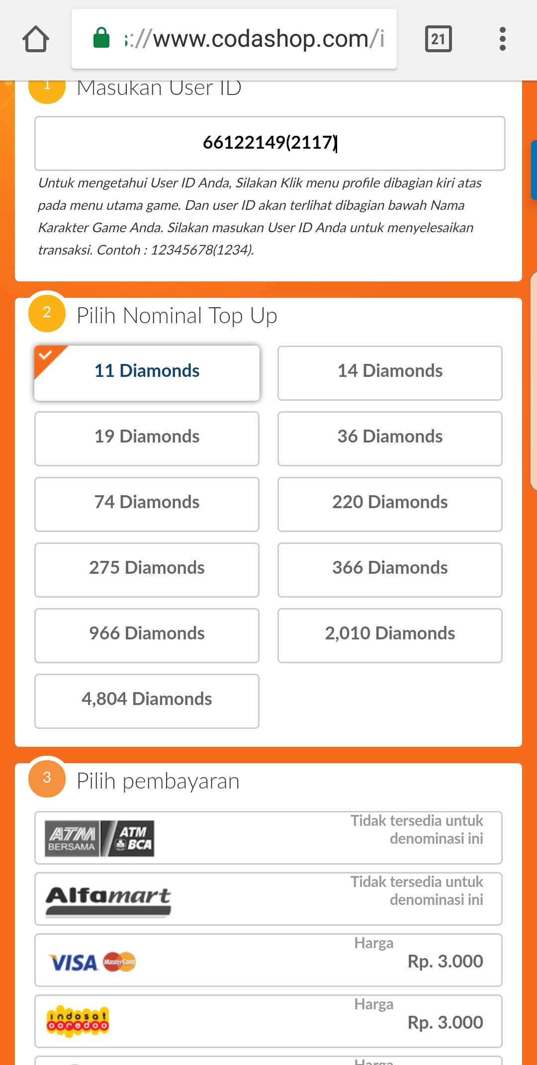 4. Pilih Nominal Top Up 11 Diamonds.