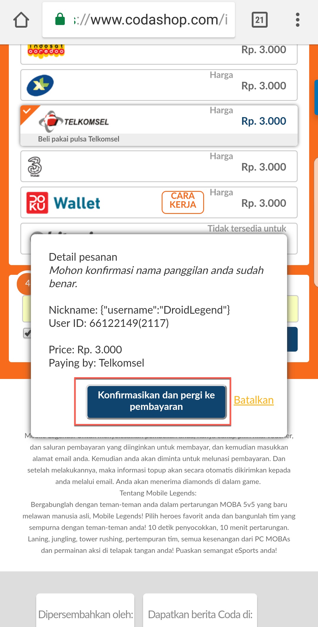 Jika berhasil dan kamu memiliki cukup pulsa maka akan terdapat pesan “Anda telah membeli Mobile Legends senilai Rp….”.