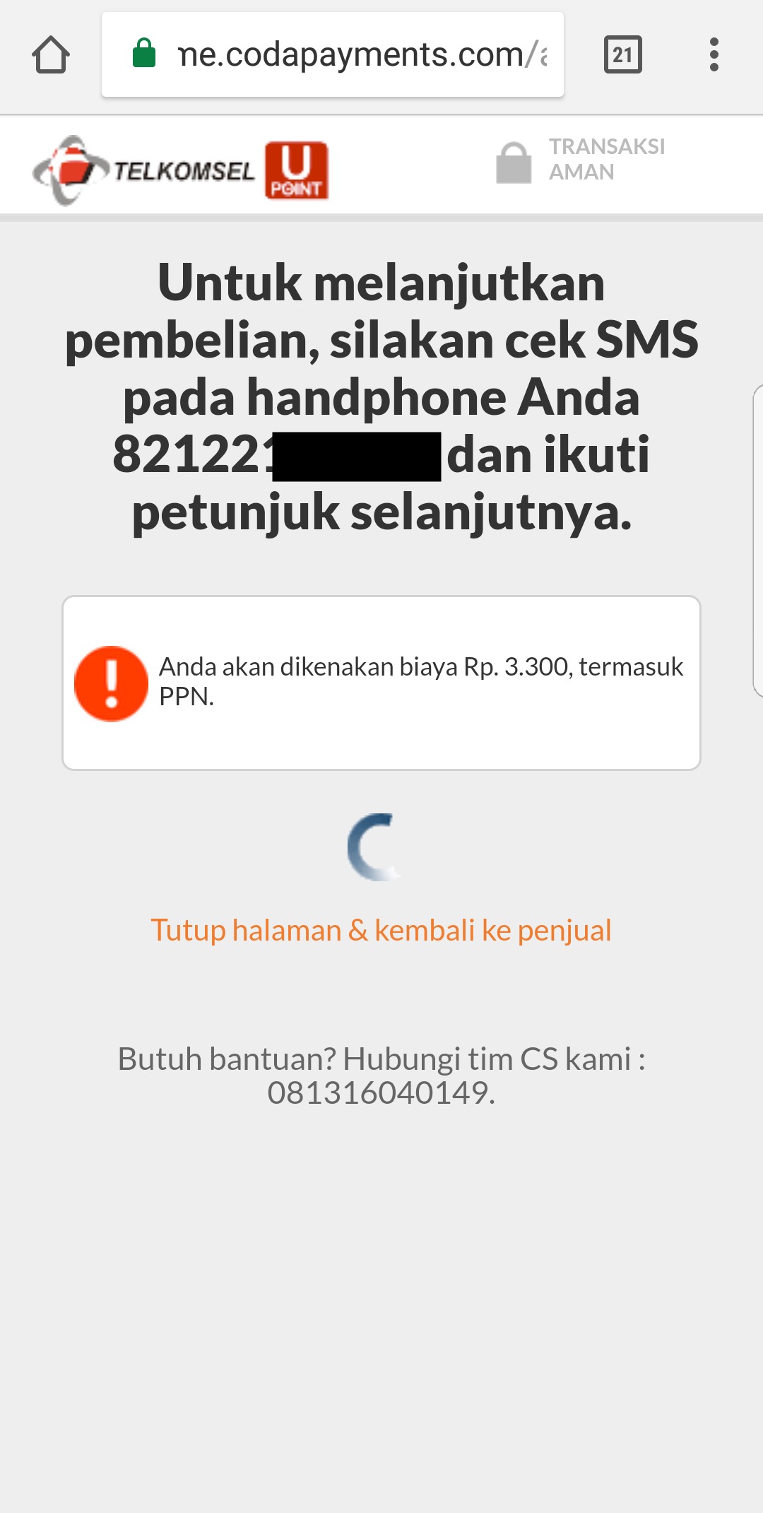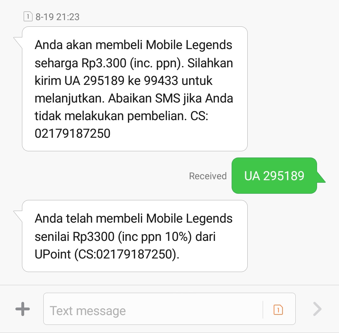 8. Tutup browser jangan di close, lalu periksa inbox atau notifikasi SMS, kamu akan dikirimkan untuk verifikasi melalui SMS berisi pesan “Anda akan membeli Mobile Legends seharga Rp….”.