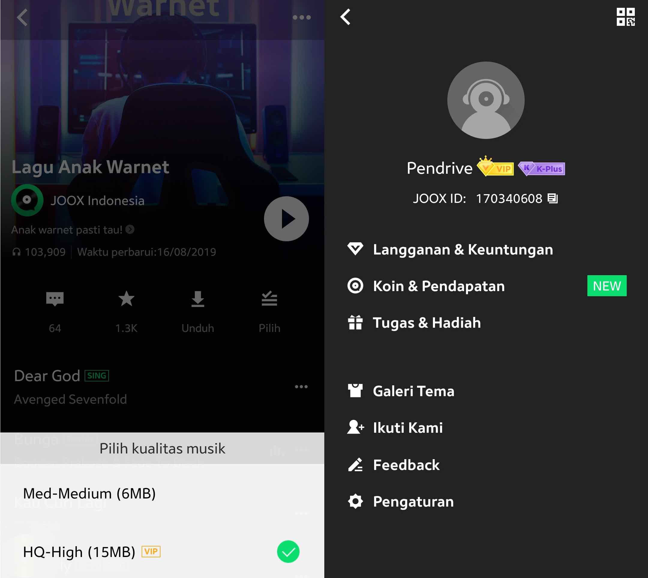 Dengan aplikasi JOOX ini kamu akan merasakan layaknya menggunakan akun VIP/KVIP JOOX. Aplikasi JOOX modifikasi ini dapat memutar semua lagu dengan kualitas tinggi dan dapat mengunduh lagu menjadi offline mode dengan kualitas high.