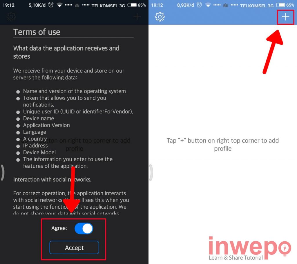 2. Langsung buka aplikasi WhatsOnTracker / Netwa yang sudah kita install. Lalu tap Agree dan kemudian pilih Accept saat pertama kali menggunakan. Selanjutnya tap icon plus yang berada di pojok kanan atas untuk mulai menambahkan target.