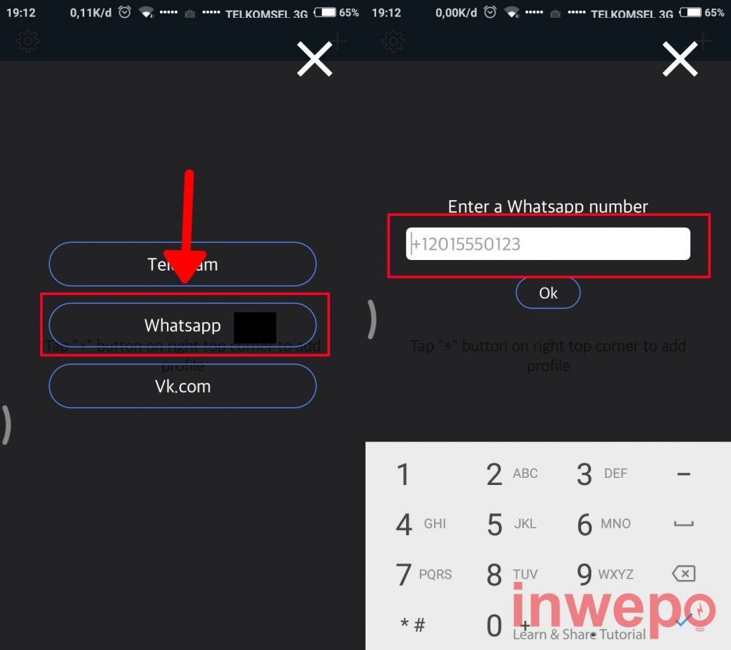 3. Pilih WhatsApp lalu masukkan nomor WhatsApp target atau teman dengan diawali kode negara Indonesia yakni (+62).