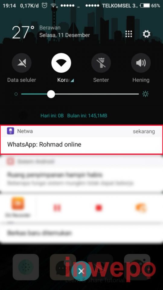 Untuk mengetahui teman atau seseorang sedang online atau offline di WhatsApp, tentunya kita harus sering-sering bolak-balik melihat ke chat kontak dari orang yang kita tunggu tersebut. Karena biasanya status text online akan muncul di bawah nama kontak chat. Namun jika menunggu terlalu lama pastinya akan membosankan. Nah, untuk itu kali ini inwepo akan membagikan triknya agar kita bisa mendapat notifikasi langsung ketika teman atau orang yang kita tunggu sedang online.