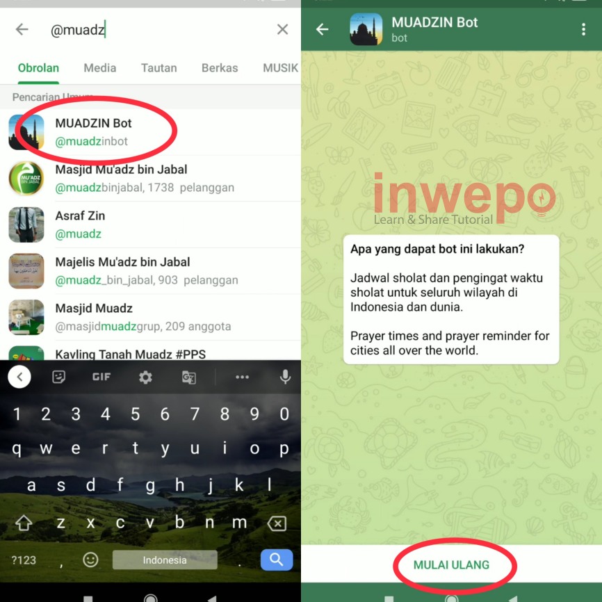 1. Langkah pertama buka dulu aplikasi Telegram kamu. Kemudian langsung tap pada kolom pencarian @muadzinbot. Jika sudah masuk ke chat bot kemudian tap menu Mulai yang ada di bagian bawah.