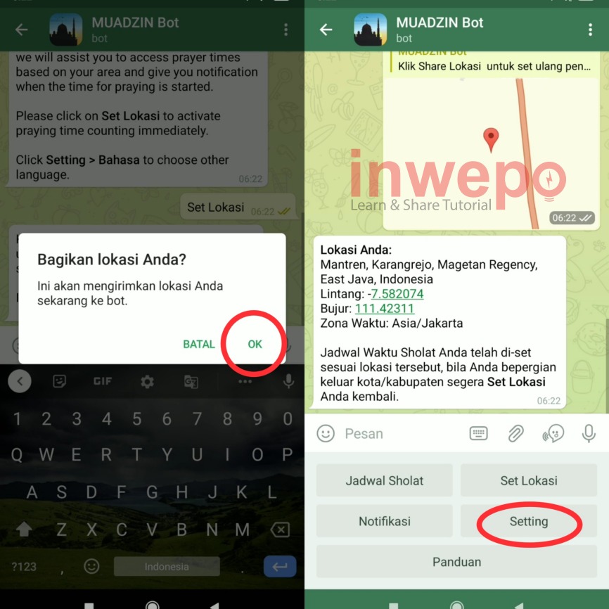 3. Akan muncul pop up notifikasi untuk membagikan lokasi terkini dengan bot, tap saja OK berikutnya tap menu Settings.