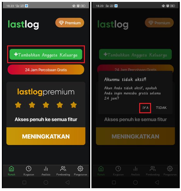 2. Pada halaman utama aplikasi LastLog, tekan tombol + Tambahkan Anggota Keluarga. Kemudian akan muncul notifikasi penggunaan uji coba gratis selama 24 jam. Tekan tombol Iya.