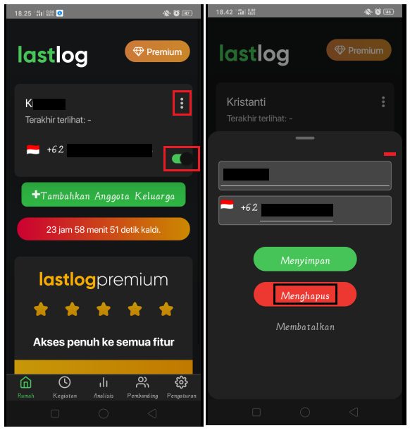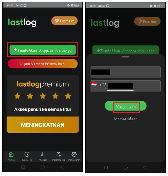 3. Tekan kembali tombol + Tambah Anggota Keluarga. Ketikkan nama dan nomor telepon pada kolom yang tersedia. Tekan tombol Menyimpan untuk simpan nomor tersebut di aplikasi LastLog.