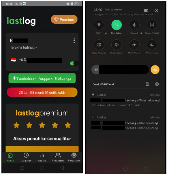 4. Kini nomor telepon sudah tersimpan dalam aplikasi. Kemudian setelah itu ketika nomor telepon tesebut mengakses aplikasi WhatsApp, maka aplikasi LastLog akan memberikan notifikasi bahwa nomer tersebut sedang online. Menariknya lagi selain memberi notifikasi online, aplikasi LastLog juga memberikan notifikasi offline.