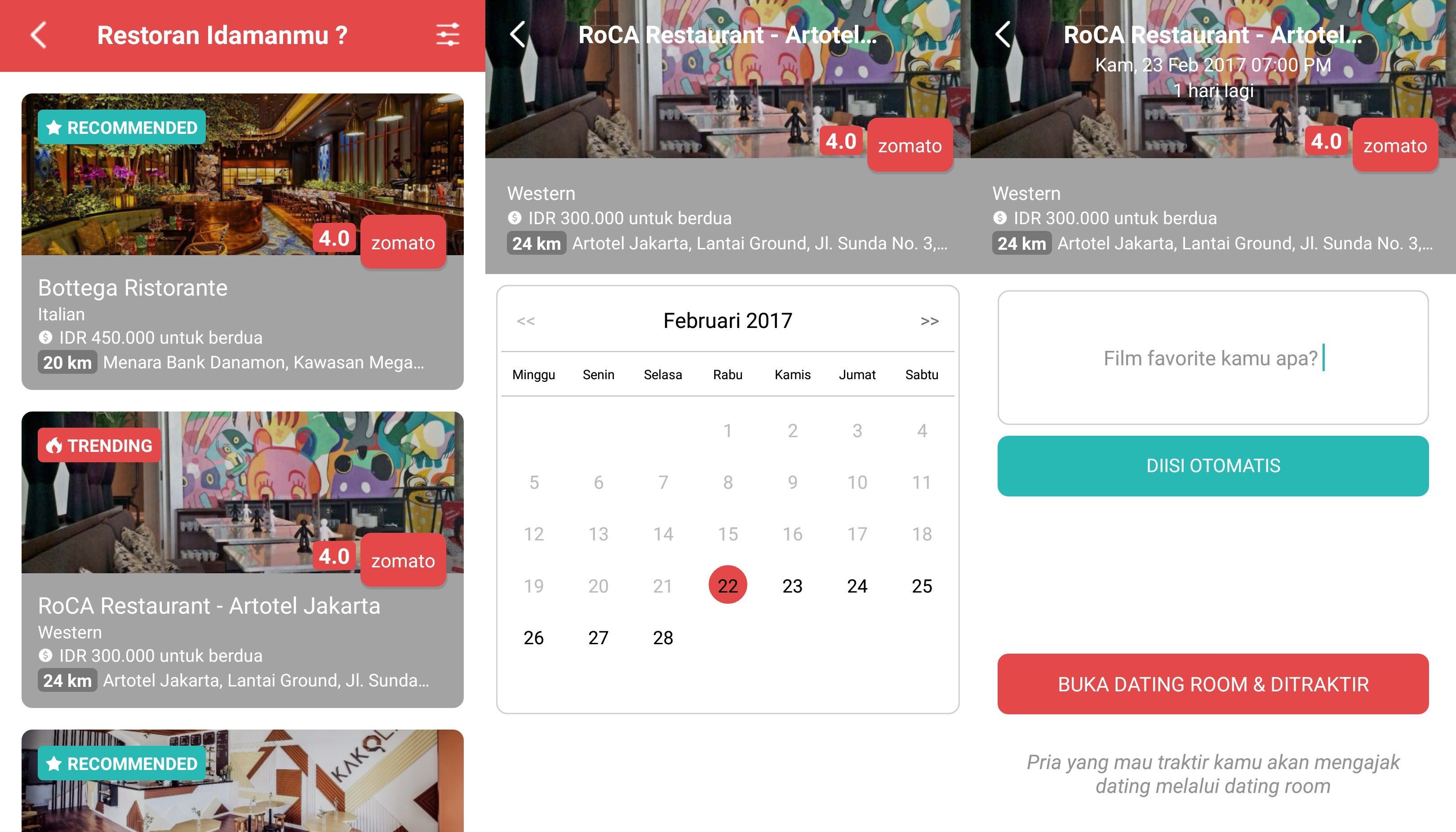 Didukung oleh Zomato, aplikasi kuliner yang memiliki lebih dari 1 juta daftar restoran untuk kamu pilih menjadi tempat kencan impianmu. Kamu juga bisa meminta tim Cinlok untuk booking restoran tersebut sehingga tidak perlu takut tidak mendapatkan tempat saat dating nanti. Asik banget kan!