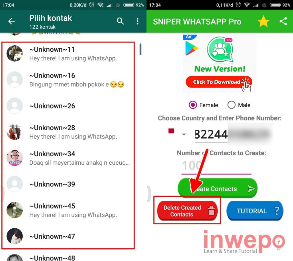 4. Biasanya kontak yang ditambahkan dari aplikasi Sniper WhatsApp PRO berawalan dengan kata “Unknown“. Jika dirasa tidak cocok dengan kontak yang di dapat, kamu bisa langsung menghapusnya dengan kembali ke layar awal aplikasi dan tap Deleted Created Contacts.