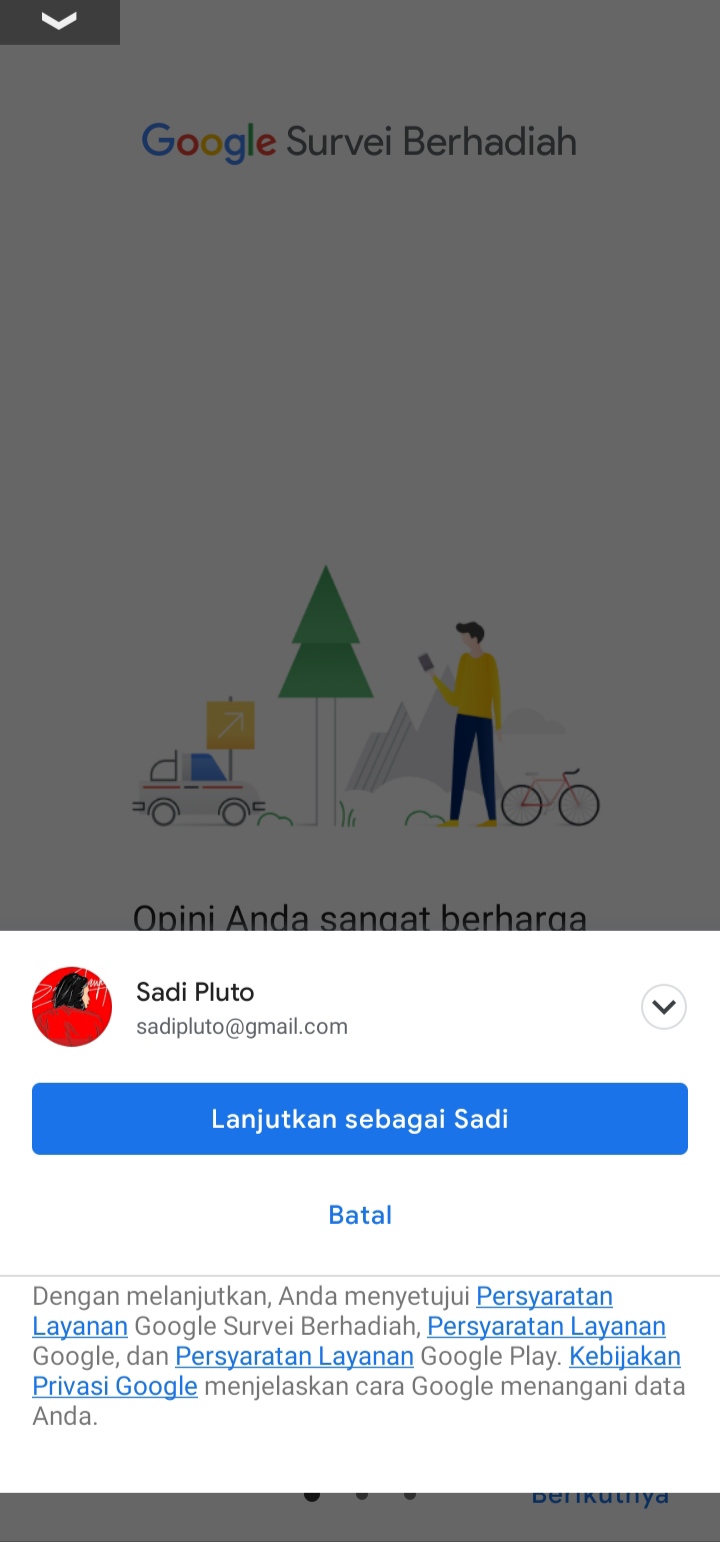2. Daftarkan akun email yang sudah terhubung di smartphone kita lalu isi beberapa data yang di butuhkan untuk memulai mendapatkan survei yang tersedia.