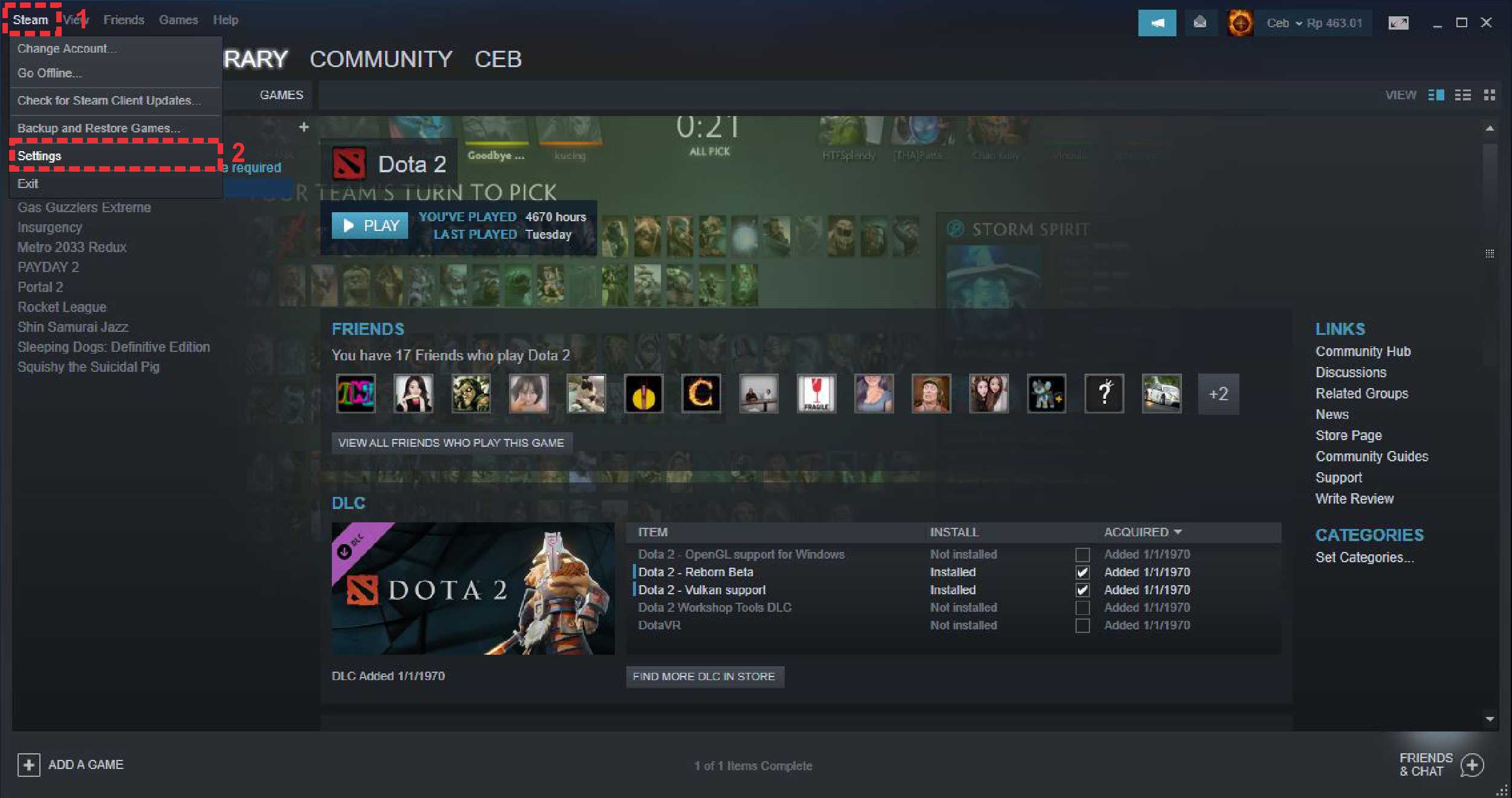 2. Pada menu utama, klik menu Steam di pojok kiri atas. Kemudian pilih settings.