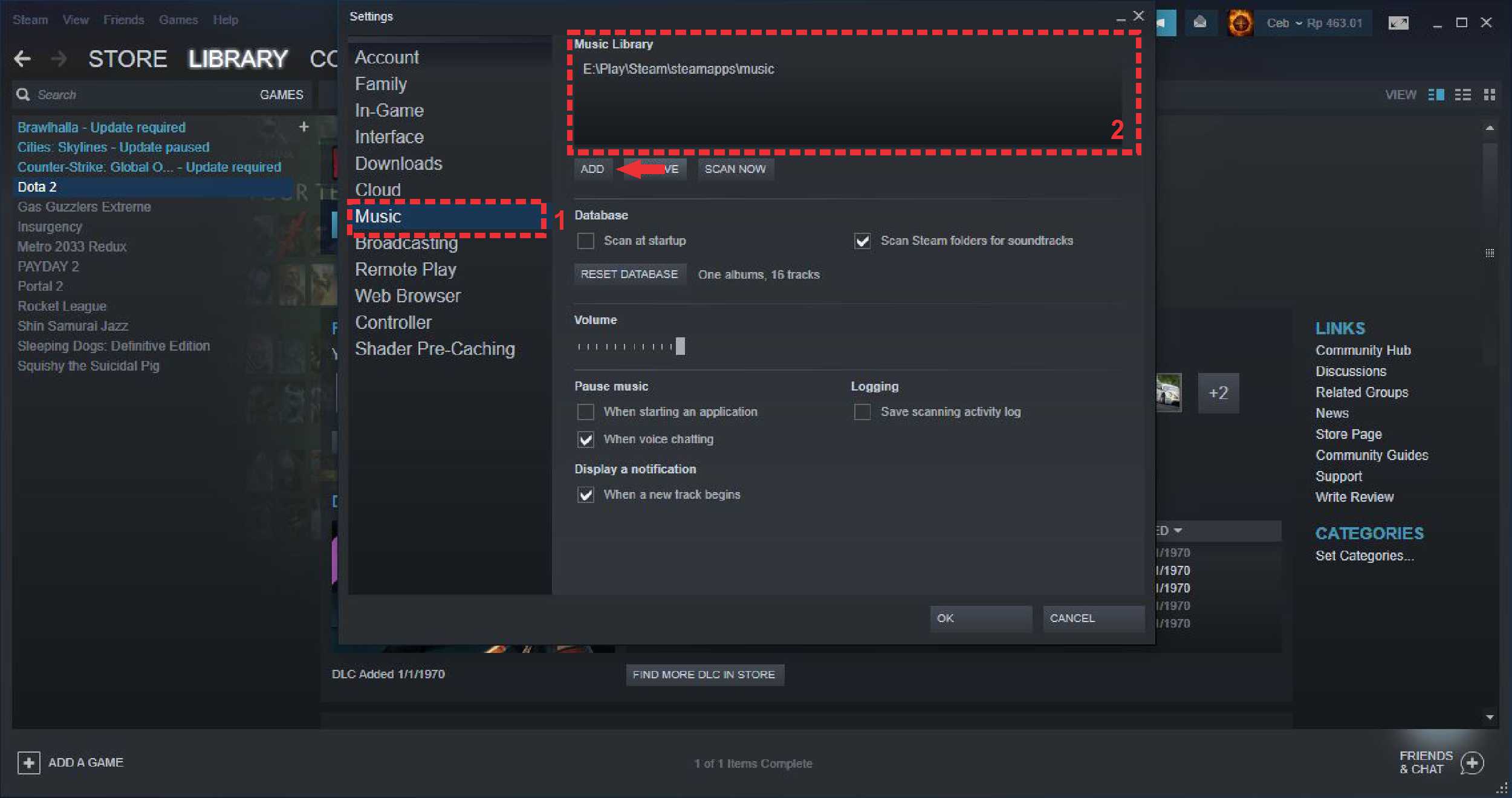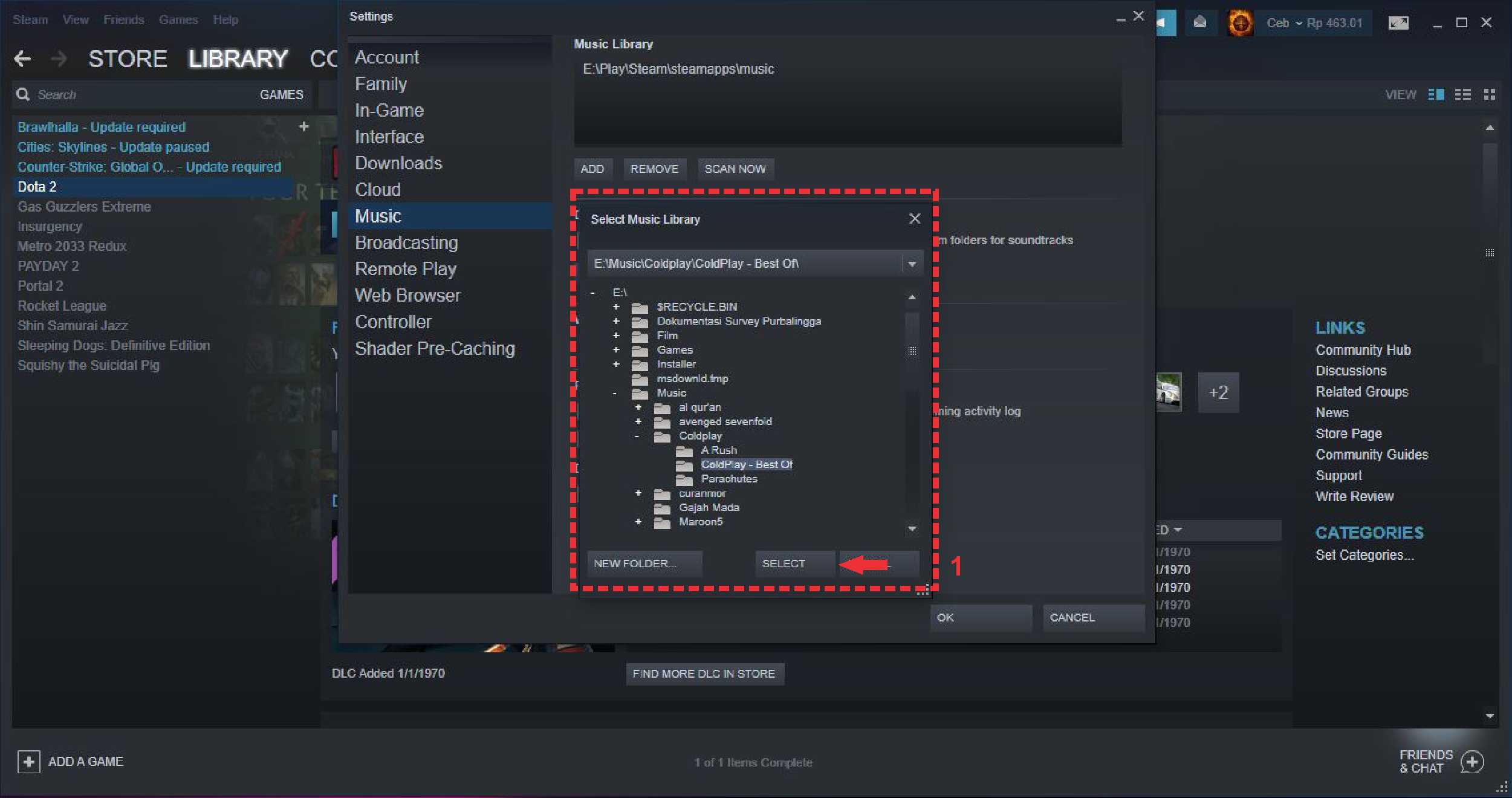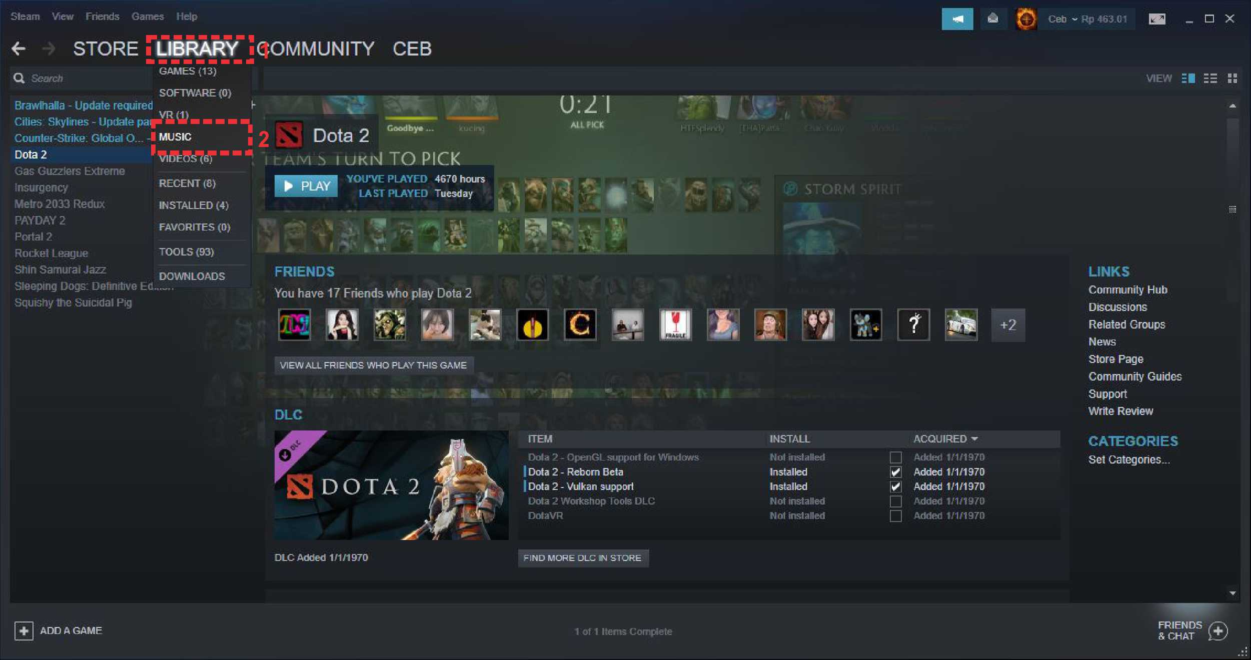6. Kembali ke menu utama steam. Pilih menu library, kemudian pilih music.