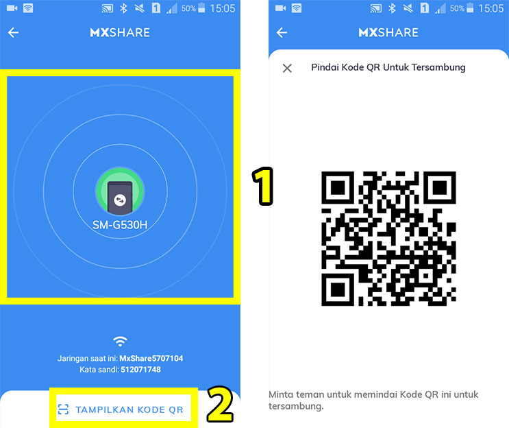 4. Tunggu hingga ponsel mendeteksi perangkat lain dan pilih ikon perangkat yang muncul. Jika baru pertama kali terhubung, jangan lupa untuk memasukkan kata sandi yang tertera di layar kamu. Kita juga bisa menggunakan kode QR dengan cara menekan tampilkan Kode QR yang ada pada bagian bawah tampilan aplikasi. Setelah kode QR muncul, pastikan pengirim file men-scan kode yang tampil di layar ponsel kamu.