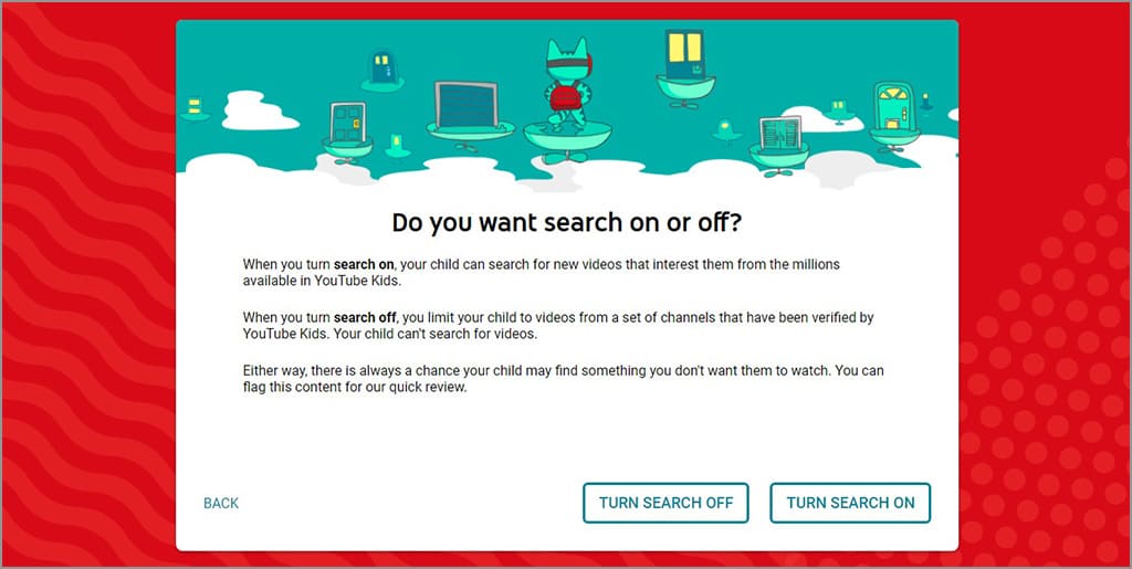 10. Akan muncul turn search off dan turn search on. Jika kamu memilih turn search off, maka anak-anak tidak akan bisa melakukan pencarian. Sebaliknya, apabila kamu memilih turn search on, anak-anak akan bisa melakukan pencarian. Lebih baik kamu memilih turn search off.