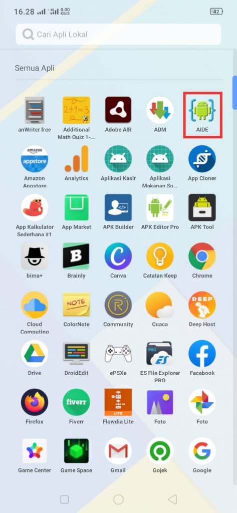2. Buka aplikasi AIDE for Android. Apabila kamu belum memasang aplikasi AIDE for Android di Android kamu, kamu bisa memasang aplikasi AIDE for Android di Play Store.