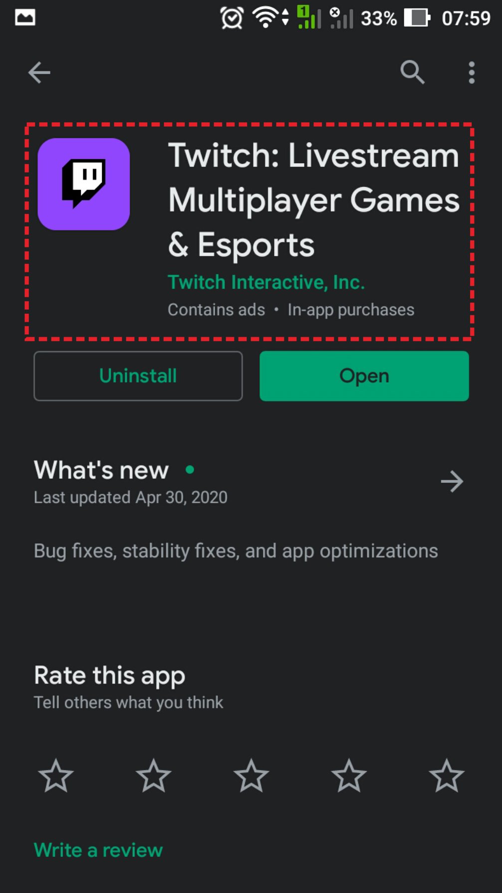 1. Langkah pertama, unduh terlebih dahulu aplikasi Twitch melalui play store. Jika proses instalasi telah selesai, klik Buka.