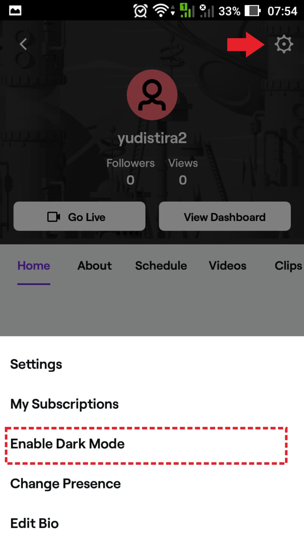 Namun jangan khawatir, karena di aplikasi Twitch ternyata juga menyediakan adanya fitur dark mode. Dengan adanya fitur dark mode, maka pancaran cahaya biru dari layar akan dikurangi sehingga mata tidak menjadi cepat lelah. Sehingga pada kesempatan kali ini, penulis akan memberikan tutorial mengenai cara mengaktifkan fitur Dark Mode di aplikasi Twitch android. Adapun untuk langkah-langkahnya adalah sebagai berikut:
